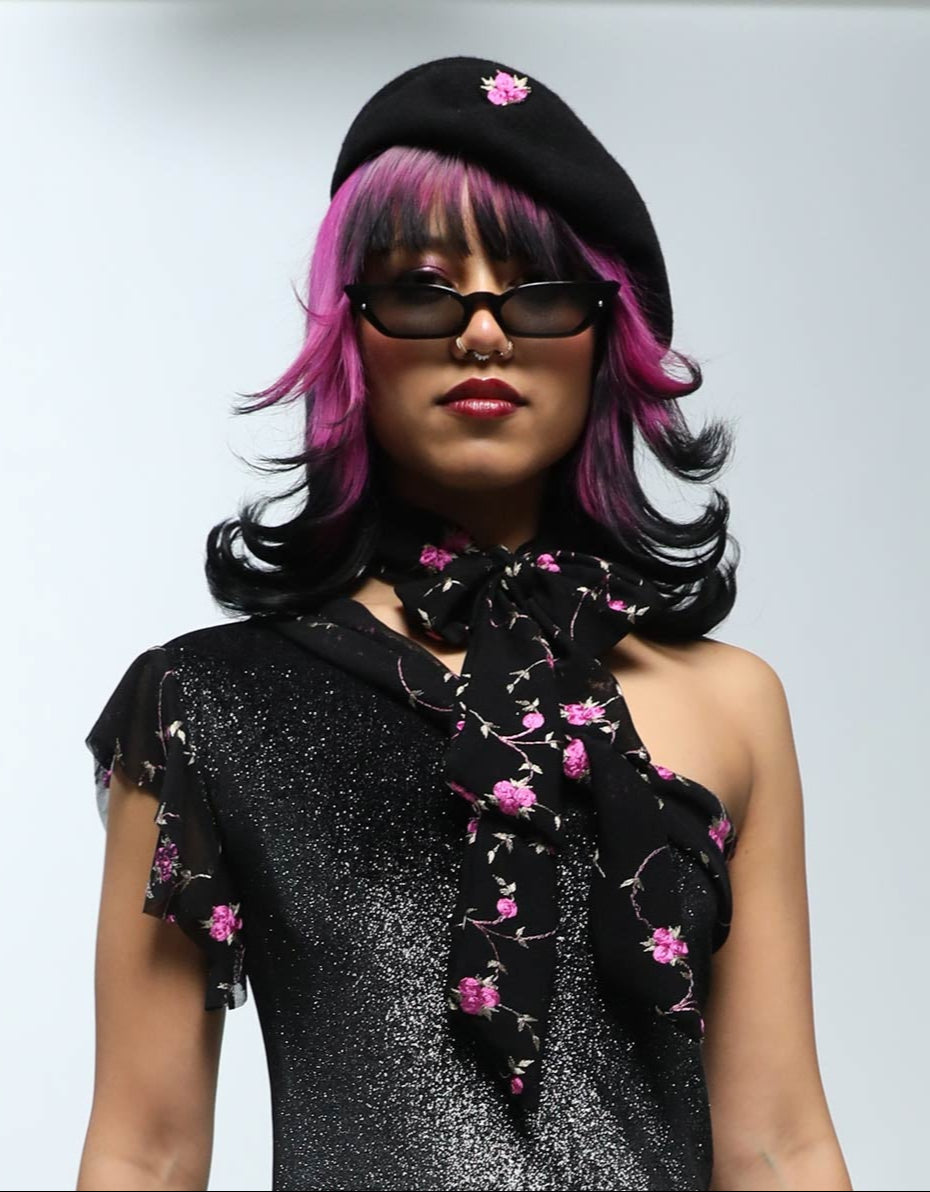 Add a splash of charm to your look with this black scarf adorned with delicate pink floral embroidery.