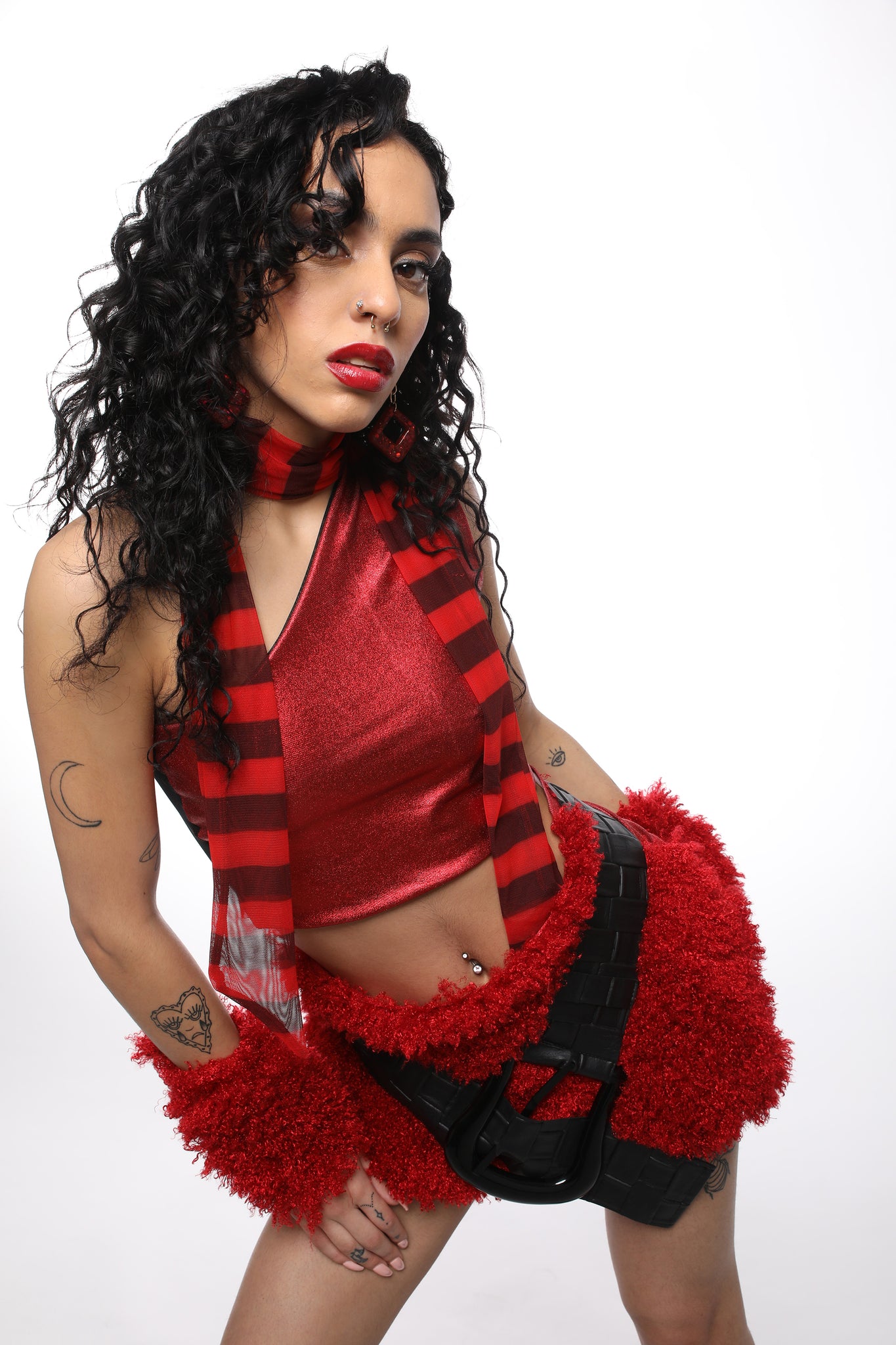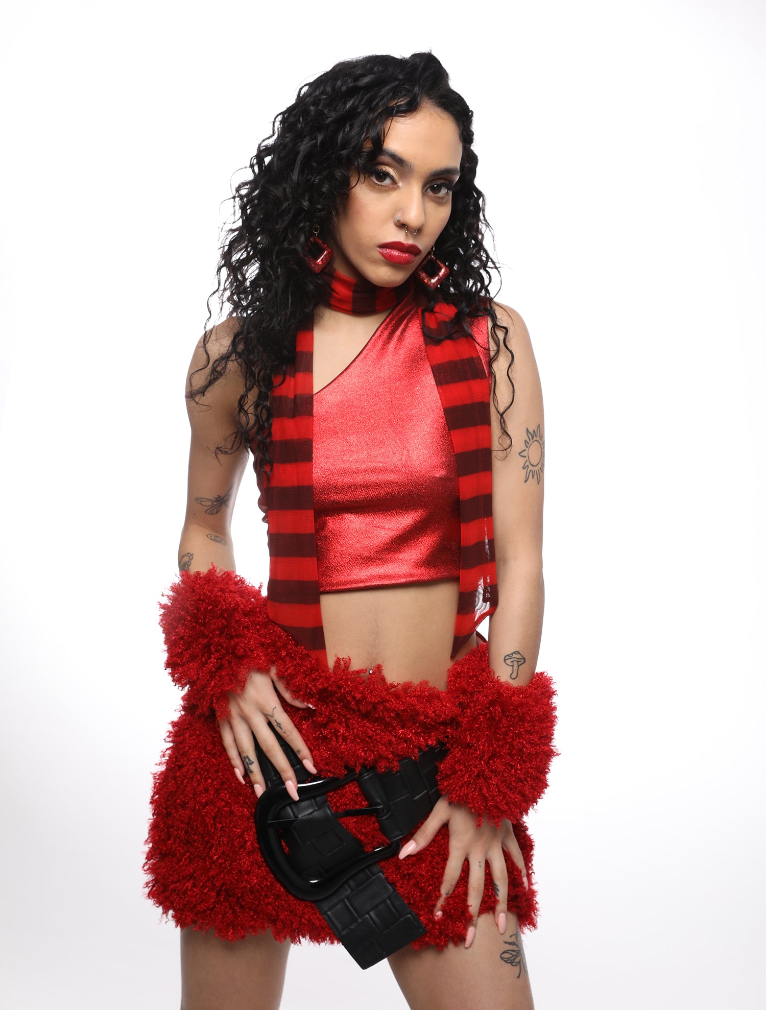 This scarf is the perfect accessory for any outfit. Made from lightweight red and black striped mesh fabric. Lightweight and versatile, it can be worn as a scarf, belt or headband.