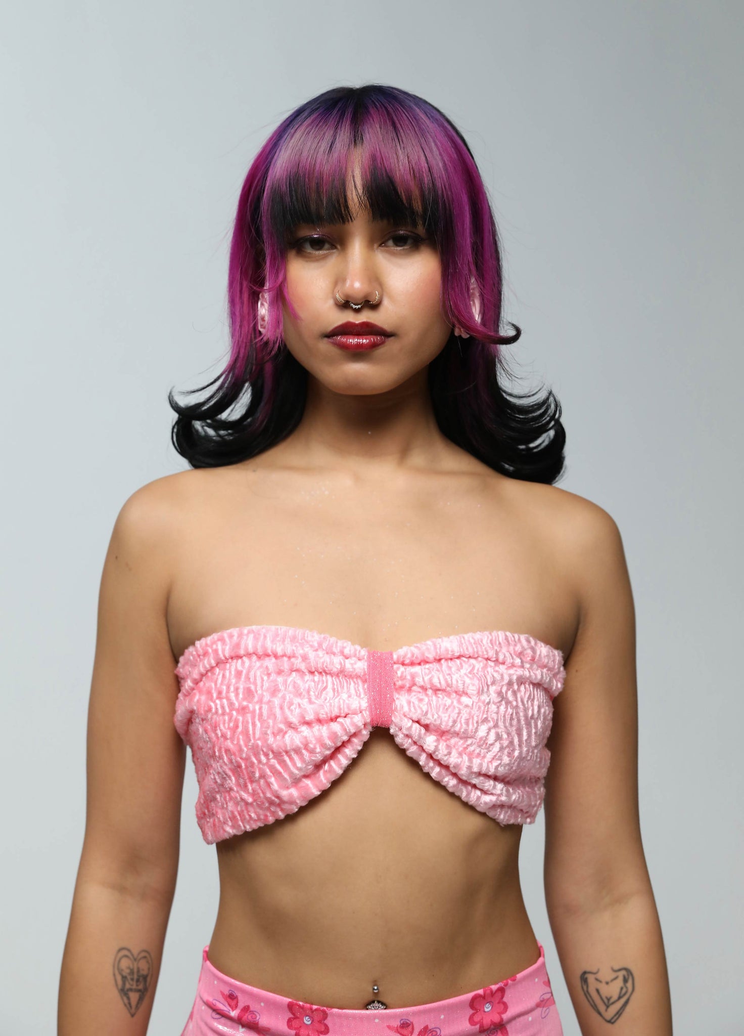 Add a pop of playful glam with this Pink Bandeau, featuring crushed faux fur and sparkling spandex for total Barbie vibes.