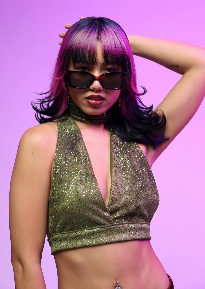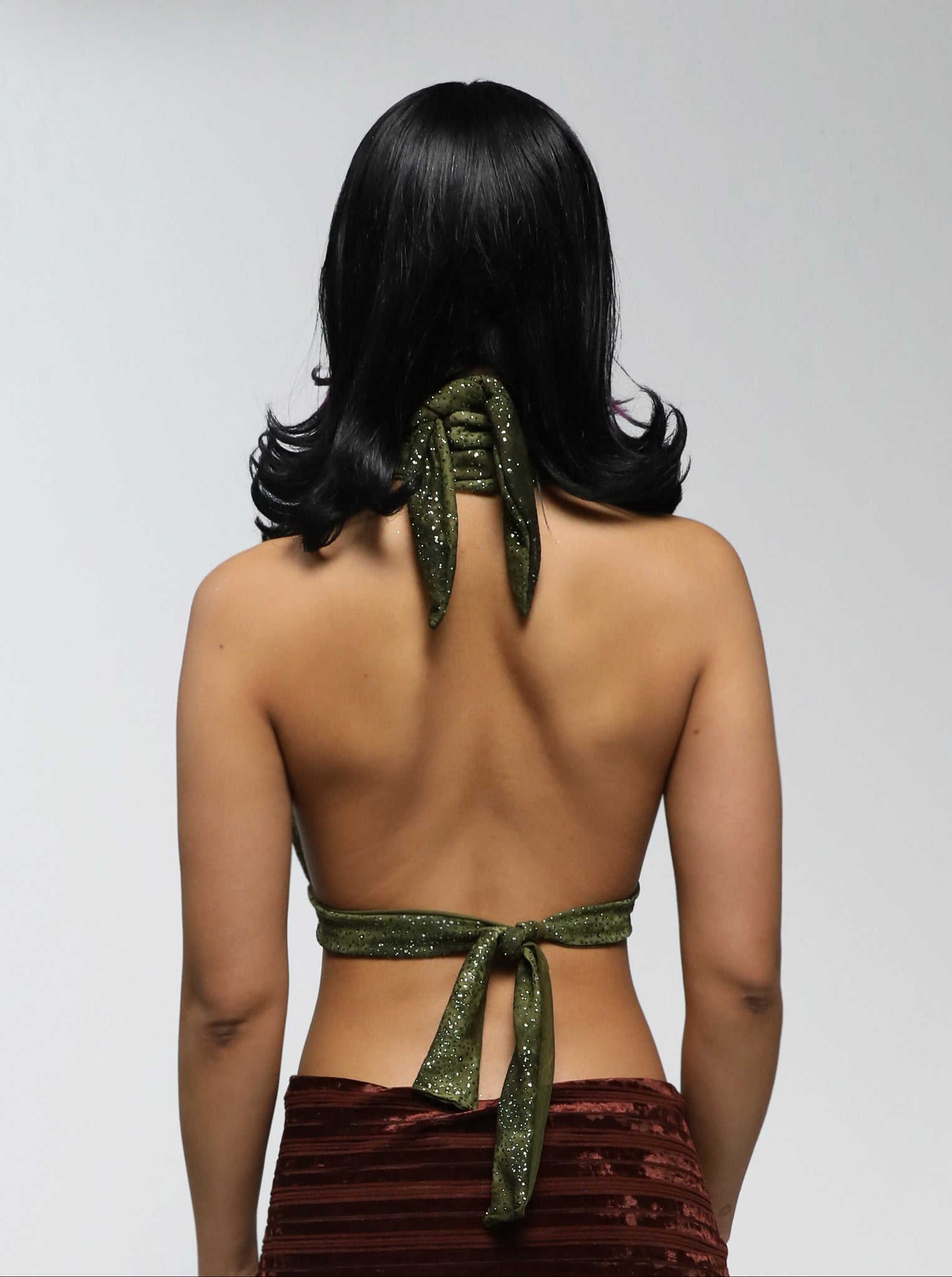 Shine bright in this dazzling green sparkle halter top! Designed with adjustable ties at the neck and back, you'll get the perfect fit every time. Whether you're hitting the dance floor or turning heads at a night out, this playful piece delivers sparkle and comfort in one fabulous top.